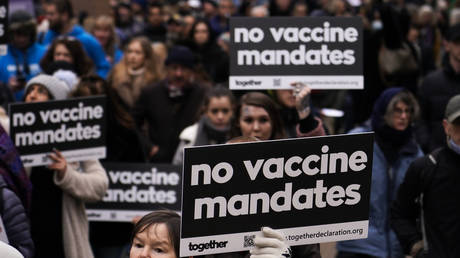 People hold placards as they attend an anti-vaccine protest in London, Britain, January 22, 2022