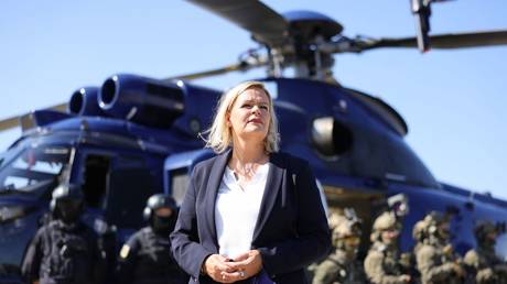 German Interior Minister Nancy Faeser poses in front of members of the GSG 9 federal police special forces unit during a visit to their training center on August 08, 2022 in Sankt Augustin, Germany