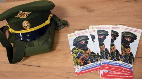 Information booklets and Russian military cap are pictured at a contract enlistment station.