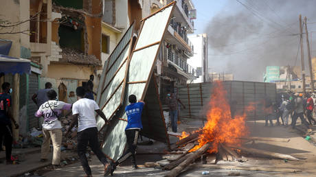 Protesters barricade a street by burning wood, tires and using iron panels as they gather at the Nation Square to stage protest against postponement of presidential election in Dakar, Senagal on February 09, 2024.