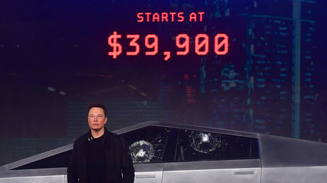 Tesla co-founder and CEO Elon Musk stands in front of the all-electric battery-powered Cybertruck at Tesla Design Center in Hawthorne, California.
