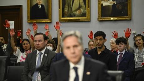 FILE PHOTO: A pro-Palestinian protest at the US House as Secretary of State Antony Blinken testifies to representatives.