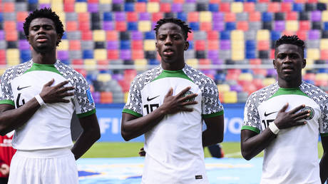 FILE PHOTO: Victor Eletu of Nigeria (C) sings the National Anthem with his teammates during FIFA U-20 World Cup Argentina 2023 Quarter Finals.
