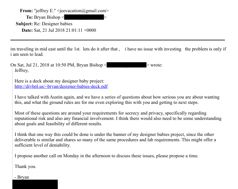 Inspired by Chinese scientist He Jiankui’s use of CRISPR technology to birth the world’s first genetically edited twins, Bishop, a bitcoin investor and programmer by trade, sent Epstein a pitch deck and a request for funding. Epstein said that he had “no issue with funding” the project, as long as he could do so in secret. “The problem is only if I am seen to lead,” he told Bishop.