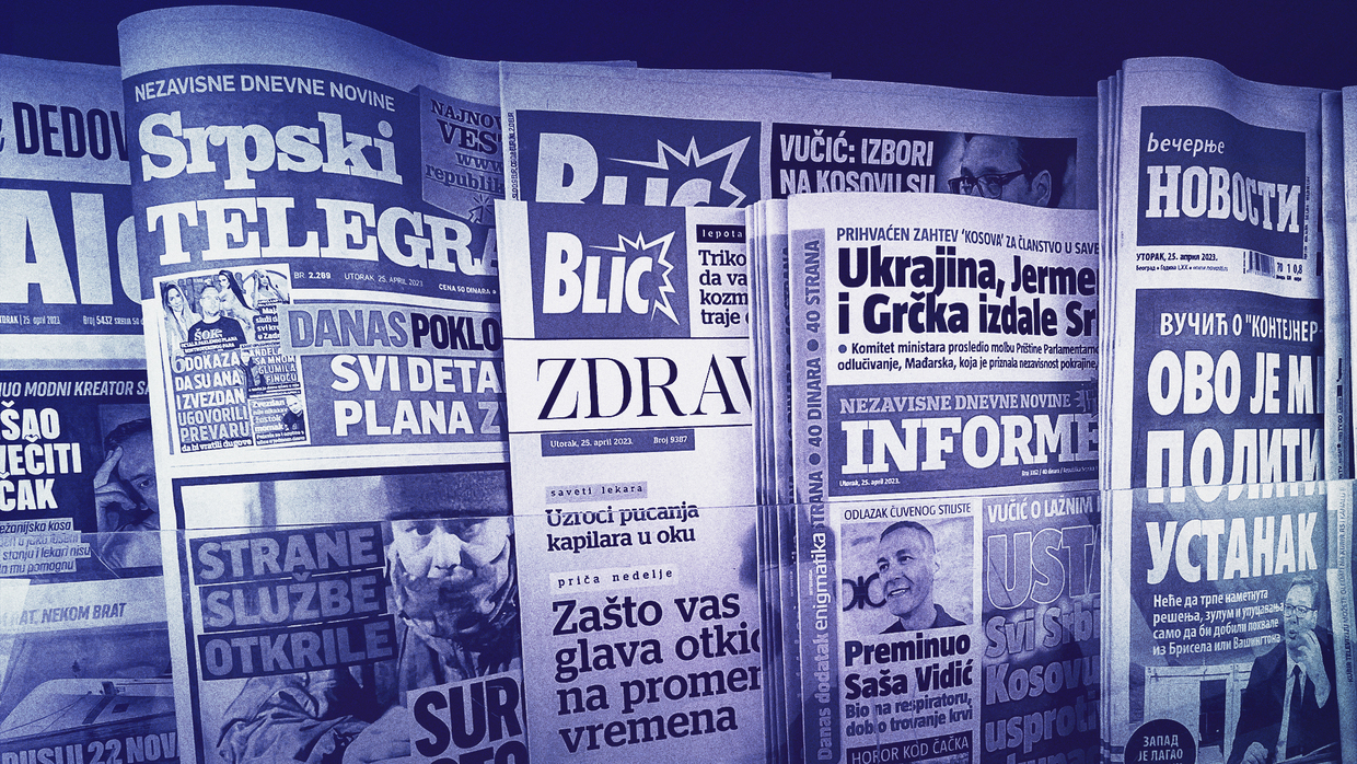 Newspapers and magazines on sale in Novi Sad, Serbia – April 2023 // RT composite.