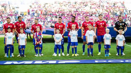 CSKA players and chilren of soldiers who have fought in Russia’s military operation in Ukraine, before a Russian Premier League match on September 14, 2024 in Moscow, Russia.