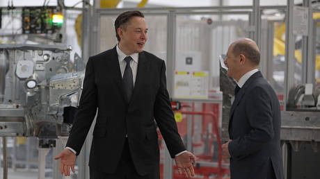 FILE PHOTO: Tesla CEO Elon Musk stands next to German Chancellor Olaf Scholz during the opening of a Tesla plant near Gruenheide on March 22, 2022