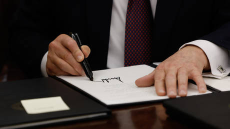 US President Donald Trump signs executive orders in the Oval Office on January 20, 2025.