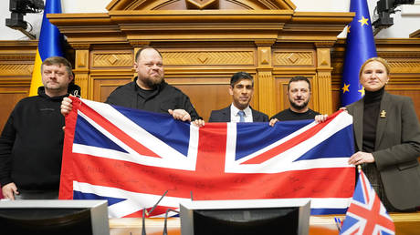 Britain's Prime Minister Rishi Sunak (C) gives a Union Jack flag to Ukrainian President Vladimir Zelensky and other Kiev officials.