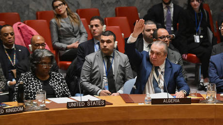 US Ambassador to the UN Linda Thomas-Greenfield listens as Algerian Ambassador Amar Bendjama speaks during a UN Security Council vote on the Israel-Hamas war, February 20, 2024.