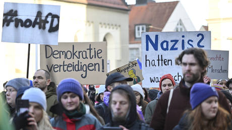 Demonstrators hold signs reading '#noAfD' and 'Defend democracy' on February 1, 2025, Bavaria, Augsburg.