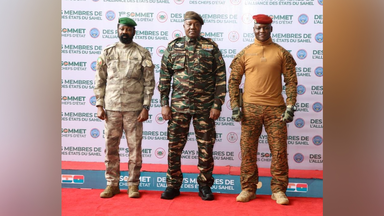 FILE PHOTO: Colonel Assimi Goïta, interim president of Mali, Brigadier General Abdourahamane Tiani, interim president of Niger, and Captain Ibrahim Traoré, interim president of Burkina Faso, take part in the first summit of the Alliance of Sahel States (AES) confederation they founded.