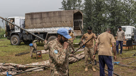 Pakistani peacekeepers dismantle their infrastructures before loading them army trucks at the United Nations Organization Mission for the Stabilization of the Congo (MONUSCO) base in Kamanyola, eastern Democratic Republic of Congo on February 28, 2024.