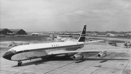 The first Boeing 707 long-range narrow-body four-engine commercial jet airliner arrives at London Heathrow Airport on April 29, 1960