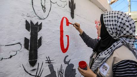 FILE PHOTO: Displaced Palestinian artists paint an anti-Israel mural in Rafah, Gaza.