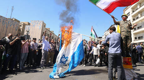Demonstrators burn Israeli flags during the funeral of seven Revolutionary Guard Corps officers killed in a strike on Iran's consulate in Damascus. Tehran, Iran, April 5, 2024
