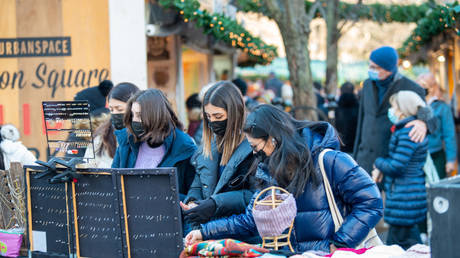 People wearing masks shop at a street vendor near the Union Square Holiday market on December 23, 2021 in New York City.