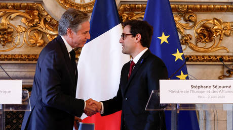 US Secretary of State Antony Blinken (L) and French Foreign Minister Stephane Sejourne (R) shake hands at the end of a joint press conference after their meeting at the Ministry of Foreign Affairs in Paris on April 2, 2024.