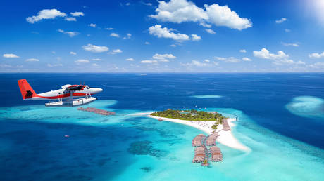 Seaplane approaching a tropical paradise island in the Maldives, Indian Ocean.