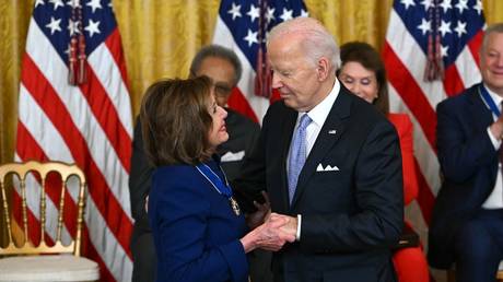 Joe Biden presents the Presidential Medal of Freedom to Nancy Pelosi in the White House in Washington DC, May 3, 2024
