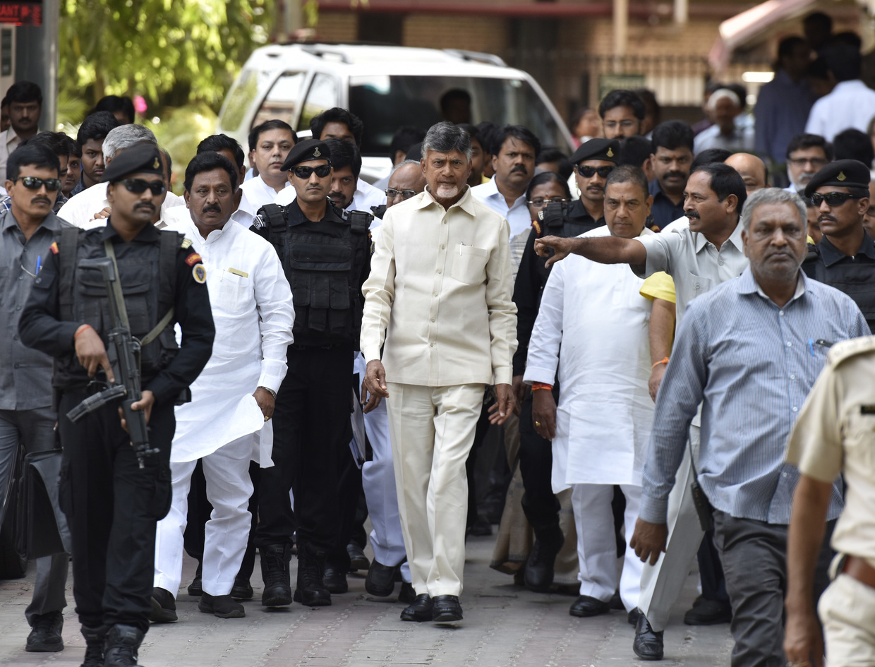 Andhra Pradesh Chief Minister and TDP President N Chandrababu Naidu along with his party leaders, leaves after meeting with Election Commission of India (ECI), at Nirvachan Sadan, on April 13, 2019 in New Delhi.