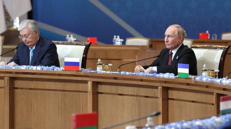 Russian President Vladimir Putin and Kazakh President Kassym-Jomart Tokayev attend the Shanghai Cooperation Organisation (SCO) plus format meeting in Astana, Kazakhstan.