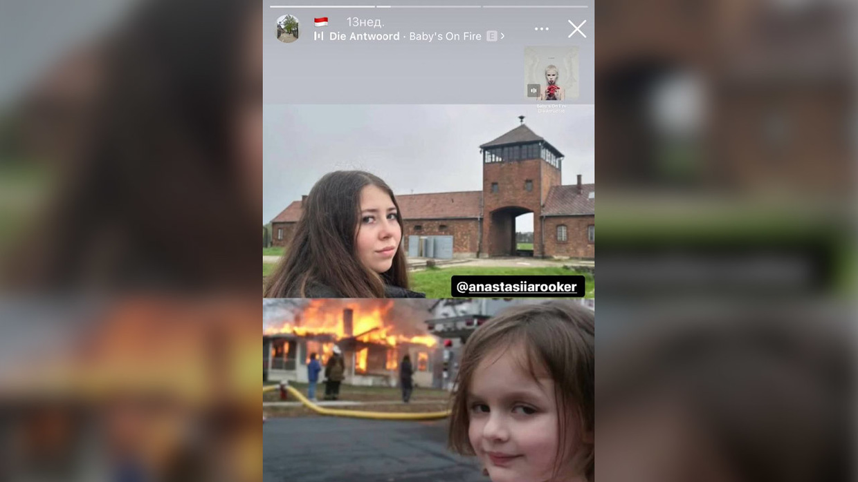 A second reel showed Miroschenko’s girlfriend Anastasia Korshykova, a member of the same brigade, standing in front of the death camp. This image was juxtaposed with a meme known as “Disaster Girl,” featuring a girl staring at the camera as a house burns behind her. The clip was accompanied by the song ‘Baby on Fire’ by the South African hip-hop group Die Antwoor.