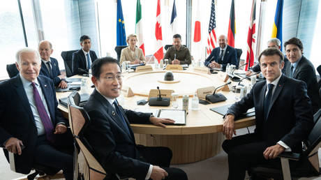Japanese Prime Minister Fumio Kishida (C-front) and G7 world leaders at a working session of the G7 Summit attended by Ukraine's Vladimir Zelensky (C-Rear) on May 21, 2023 in Hiroshima, Japan.