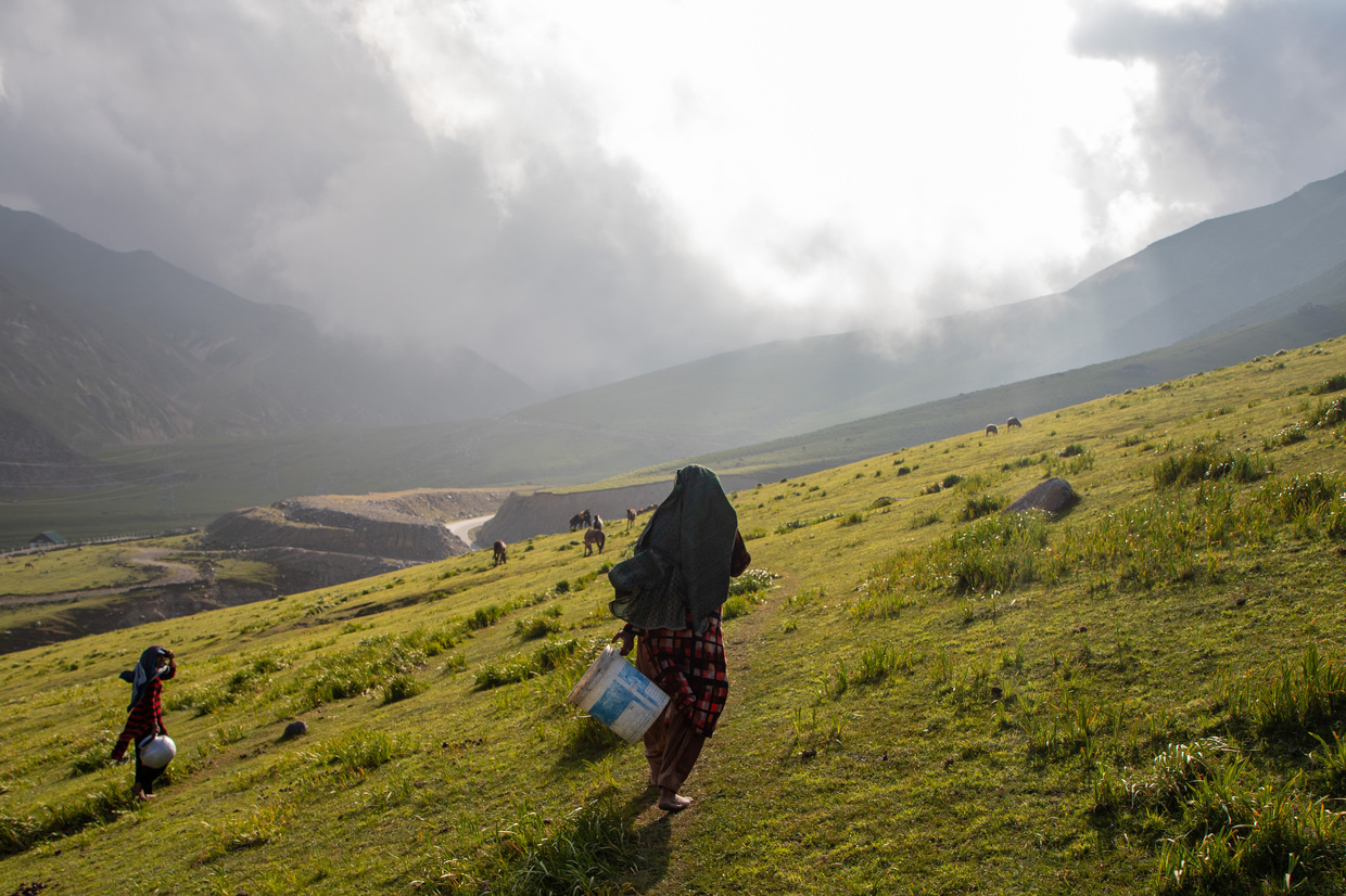 Kashmiri women walk down the hill during a sunny day near the Pir Panjal Pass, also called Peer Ki Gali, about 100 km south of Srinagar, the summer capital of Jammu & Kashmir.