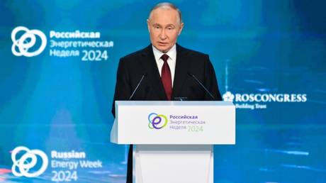 Russian President Vladimir Putin speaks during a plenary session of the 2024 Russian Energy Week International Forum in Moscow.