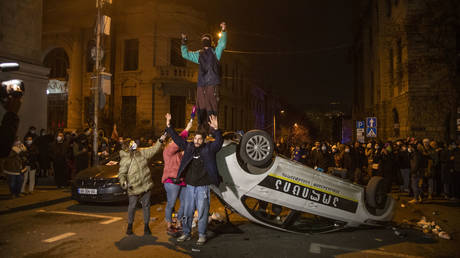 FILE PHOTO: Protestors damage a police car as they clash with law enforcement during demonstrations in Tbilisi, Georgia.