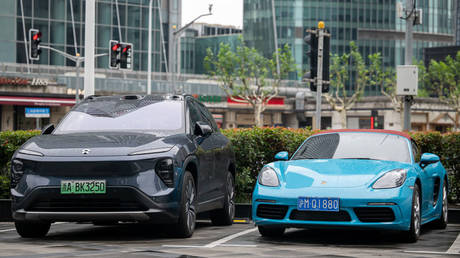 An electric car from the Chinese brand NIO and one from Porsche with a combustion engine are pictured during a visit by German Economy Minister Robert Habeck to China in June 2024.