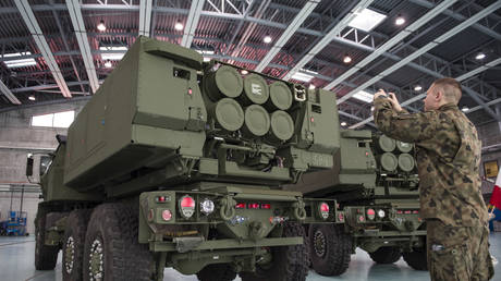 FILE PHOTO: US-made Himars rocket launchers arrive at a military base in Warsaw, Poland on May 15, 2023.