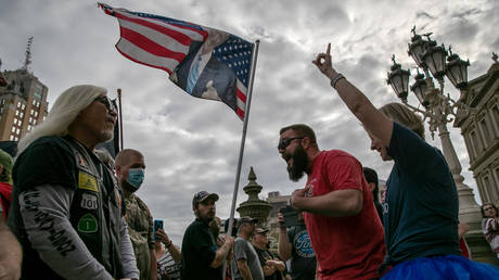 FILE PHOTO. Pro-Trump (R) and anti-Trump demonstrators argue at the Michigan state capitol in Lansing, Michigan.