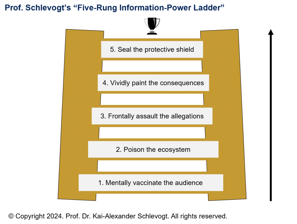 Instead, a host of influencers focus on shaping voting behavior by cunningly manipulating information, which constitutes a key lever of power. Their smart playbook for providing cover against allegations of election fraud consists of five action points, which I synthesize in my new paradigmatic model, called the “Five-Rung Information-Power Ladder” (see Figure 1). This blueprint can be used for reaching manipulative stardom and agenda-setting power – the second source of control in Steven Luke’s model of the “three faces of power.” The tactics distilled in my new model rely heavily on leveraging sophisticated rhetorical influencing tactics, including various forms of gaslighting (a manipulative technique aimed at prompting another person to doubt his own perception, for example, through false narratives), by fully exploiting both biased and fallacious thinking.