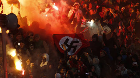 FILE PHOTO: A Nazi flag held by football hooligans during a game in Yaroslavl, Russia in 2013.
