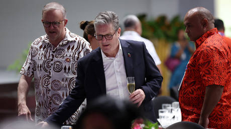 Keir Starmer, Prime Minister of the United Kingdom arrives next to Australian Prime Minister Anthony Albanese (L) at the CHOGM welcome state banquet at the Football Federation Hall on October 24, 2024 in Apia, Samoa.