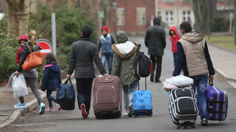 FILE PHOTO: People pulling suitcases arrive at the Central Registration Office for Asylum Seekers in Berlin, Germany.