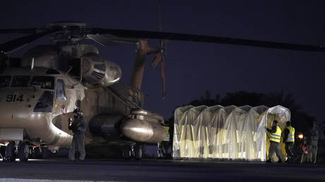 Personnel work near a helicopter that transported Israeli hostages released by Hamas at the Sheba Medical Center in Ramat Gan, Israel, November 28, 2023.
