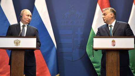 FILE PHOTO: Russian President Vladimir Putin and Hungarian Prime Minister Viktor Orban during a joint press conference in 2019.