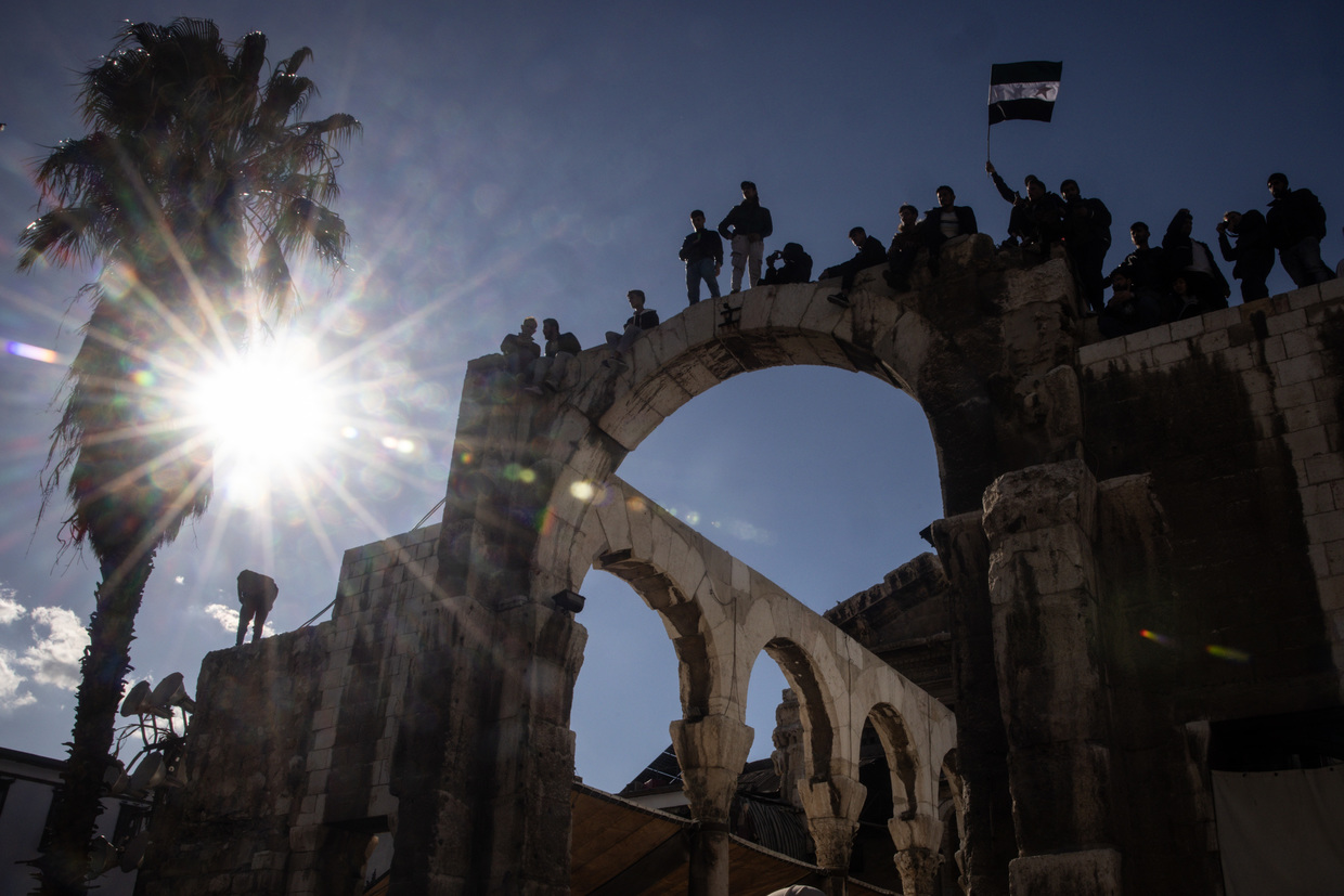People wave flags in celebration while standing on an old city wall after thousands of people participated in the first Friday prayer since the fall of the Assad regime at the Umayyad Mosque on December 13, 2024 in Damascus, Syria.