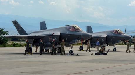 FILE PHOTO: Two U.S. Air Force F-35 Lightning II aircraft at the international airport Petrovec near Skopje, on June 17, 2022.
