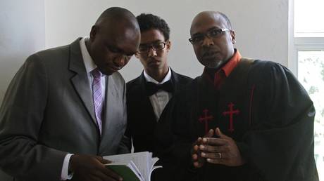 FILE PHOTO: Ugandan anti-gay preacher Pastor Martin Ssempa (R) speaks to anti-gay activists at the constitutional court in Kampala on July 30, 2014.