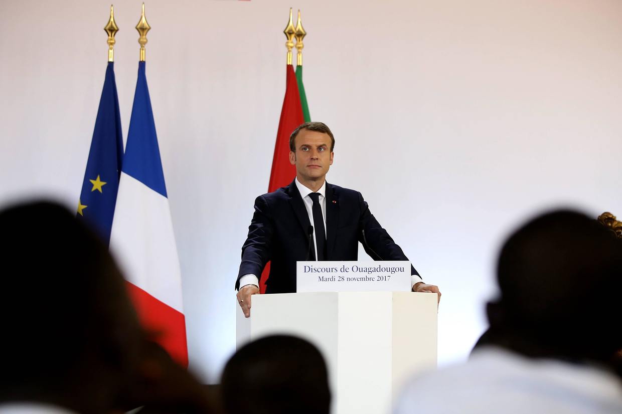 French President Emmanuel Macron gives a speech at the University of Ouagadougou in Burkina Faso on November 28, 2017.