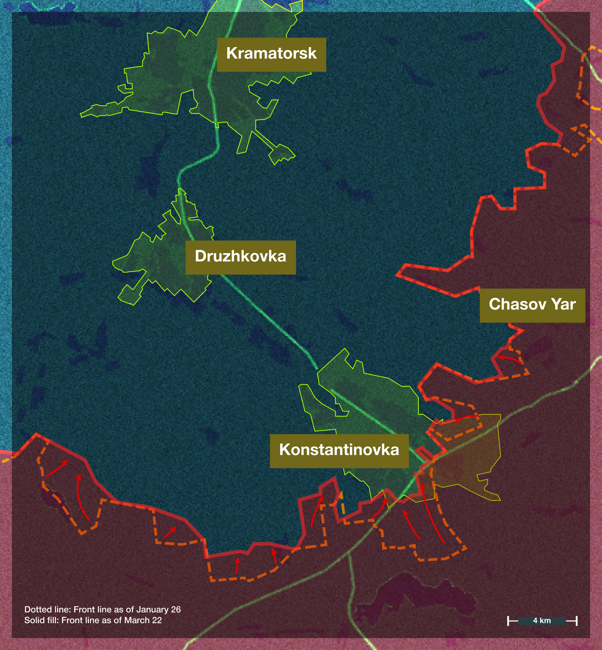 To the south, battles have continued for the strategically important city of Konstantinovka (pre-war population 78,000), which is effectively part of the Slaviansk-Kramatorsk urban conglomeration. This direction is particularly challenging: the Russian army must traverse nearly 50 kilometers of urban terrain to reach Slaviansk, and 25 kilometers to approach Kramatorsk.